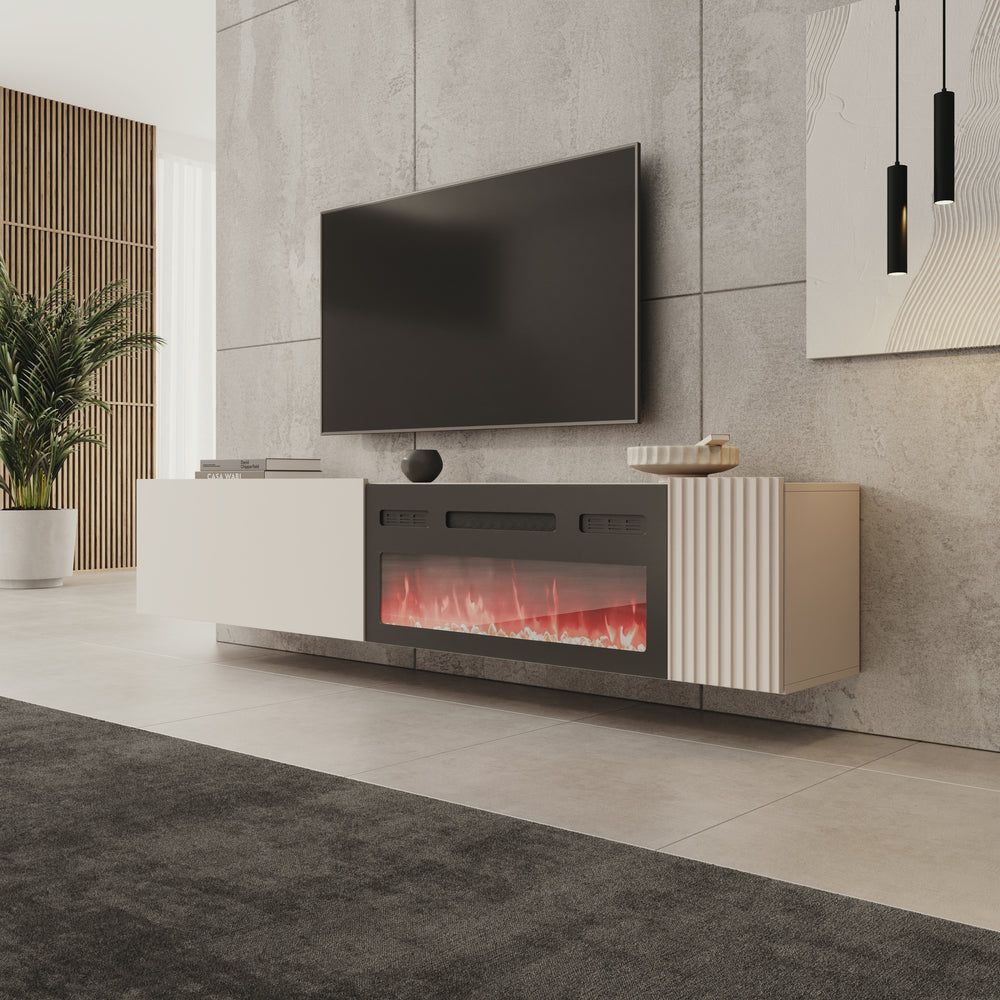 Het Cruzar TV-meubel in beige is een wandhangend model met geïntegreerde sfeerhaard. Het ontwerp combineert strakke lijnen met een rustige kleurstelling en biedt plaats voor een televisie en bijbehorende apparatuur. De haard werkt elektrisch en geeft een instelbaar vlameffect zonder rook of warmteafvoer.