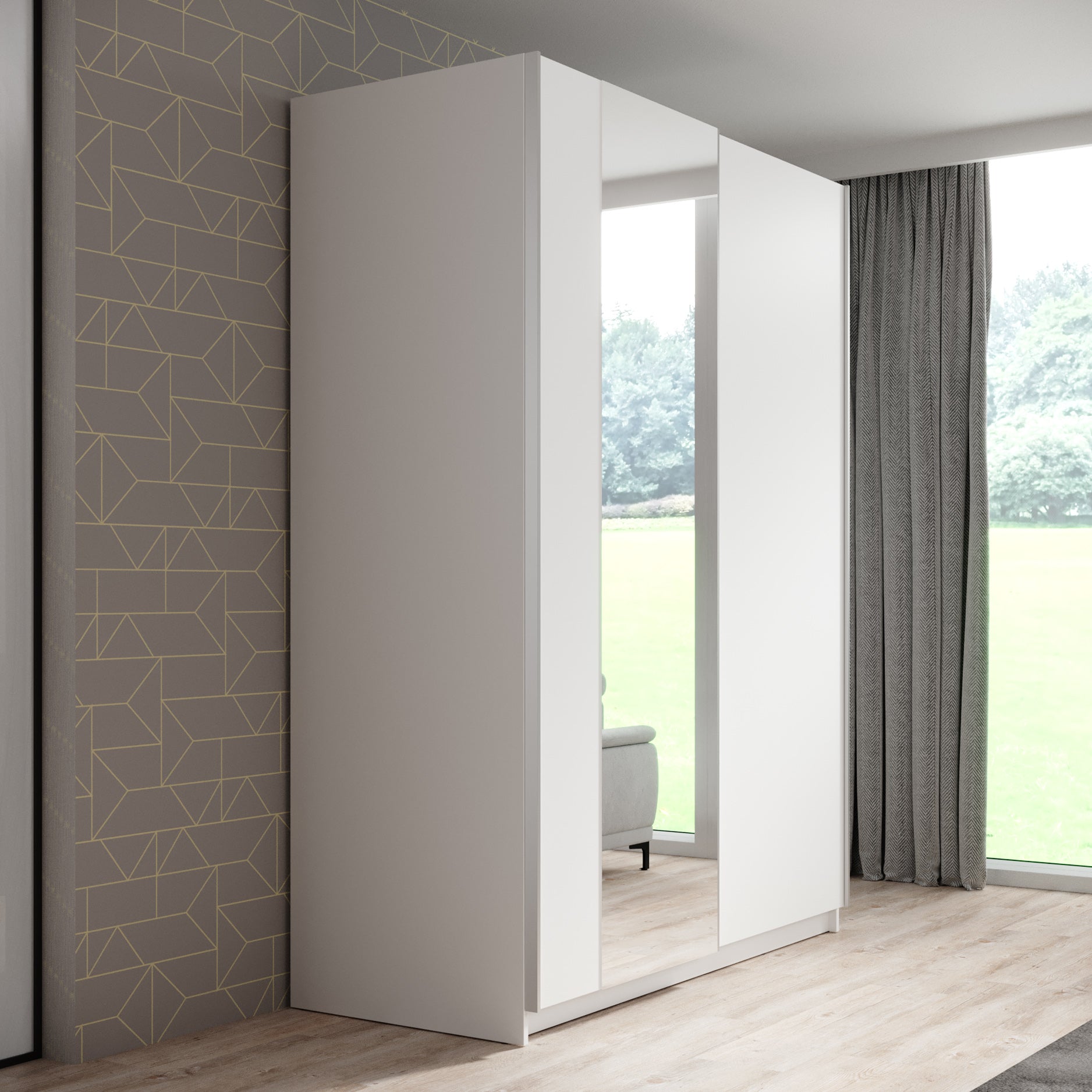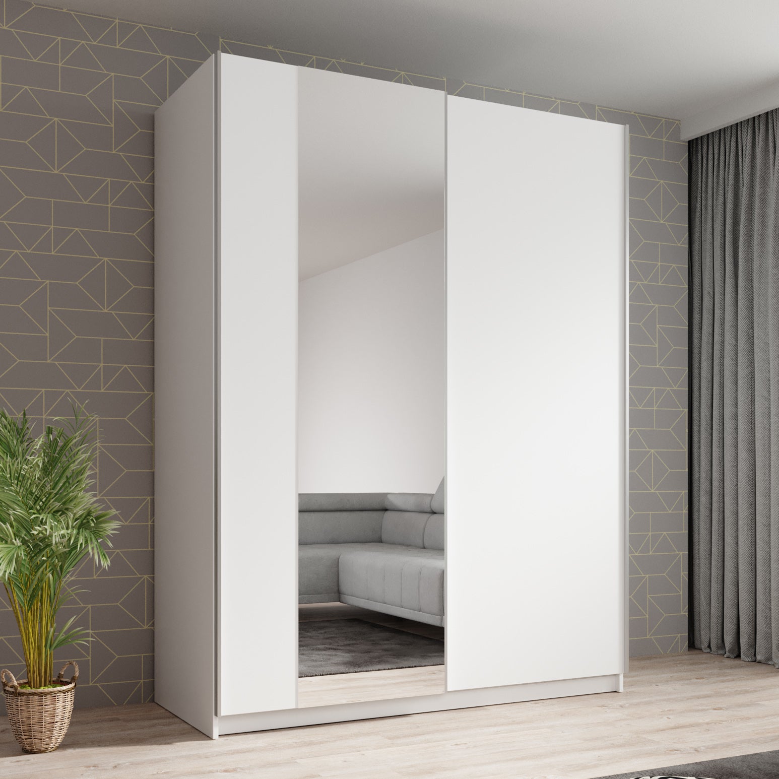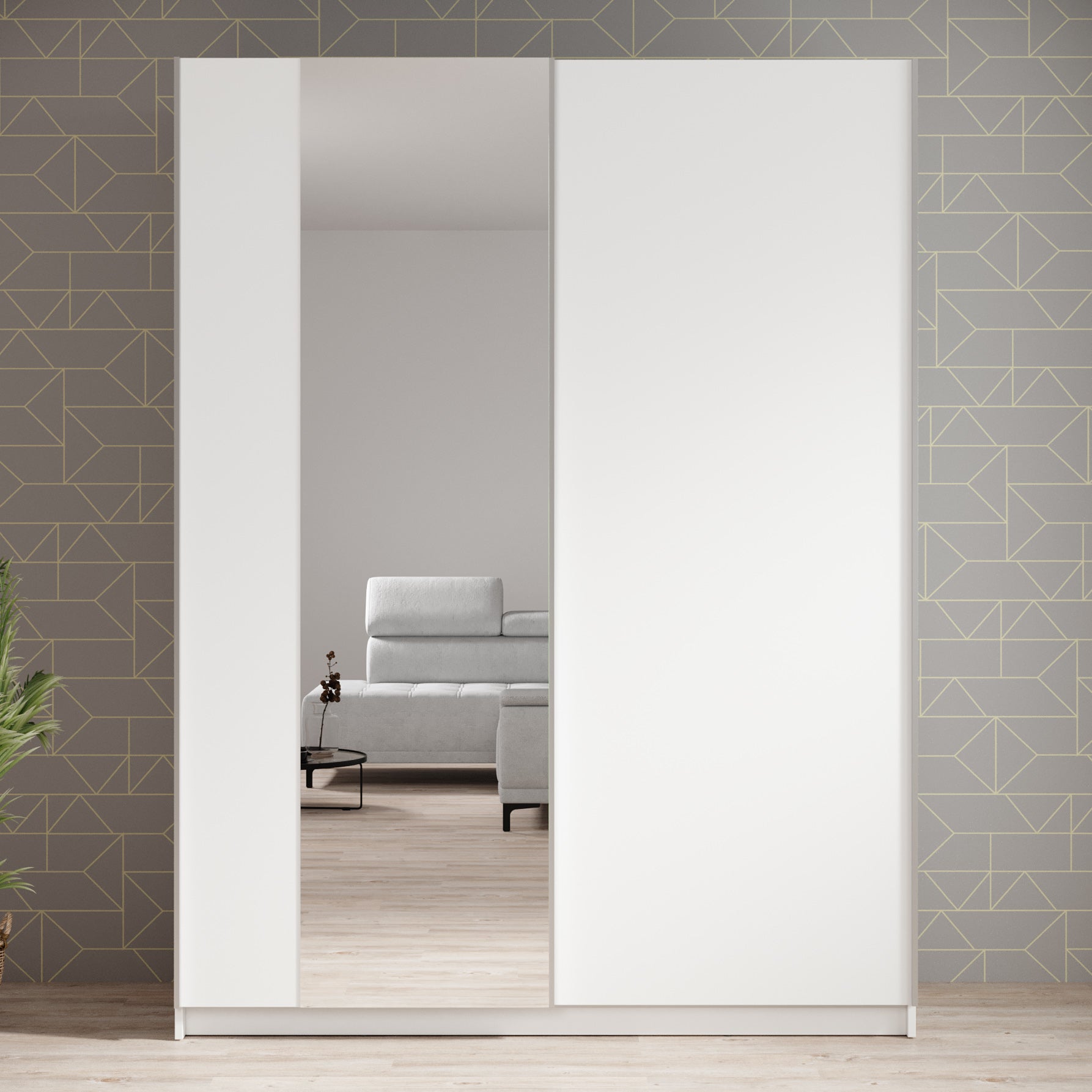 Kledingkast Ganaro in wit met spiegel is 150 cm breed en voorzien van twee schuifdeuren. Dankzij de geïntegreerde spiegel op één van de deuren is deze kast niet alleen praktisch, maar ook ruimtevergrotend in kleinere kamers.