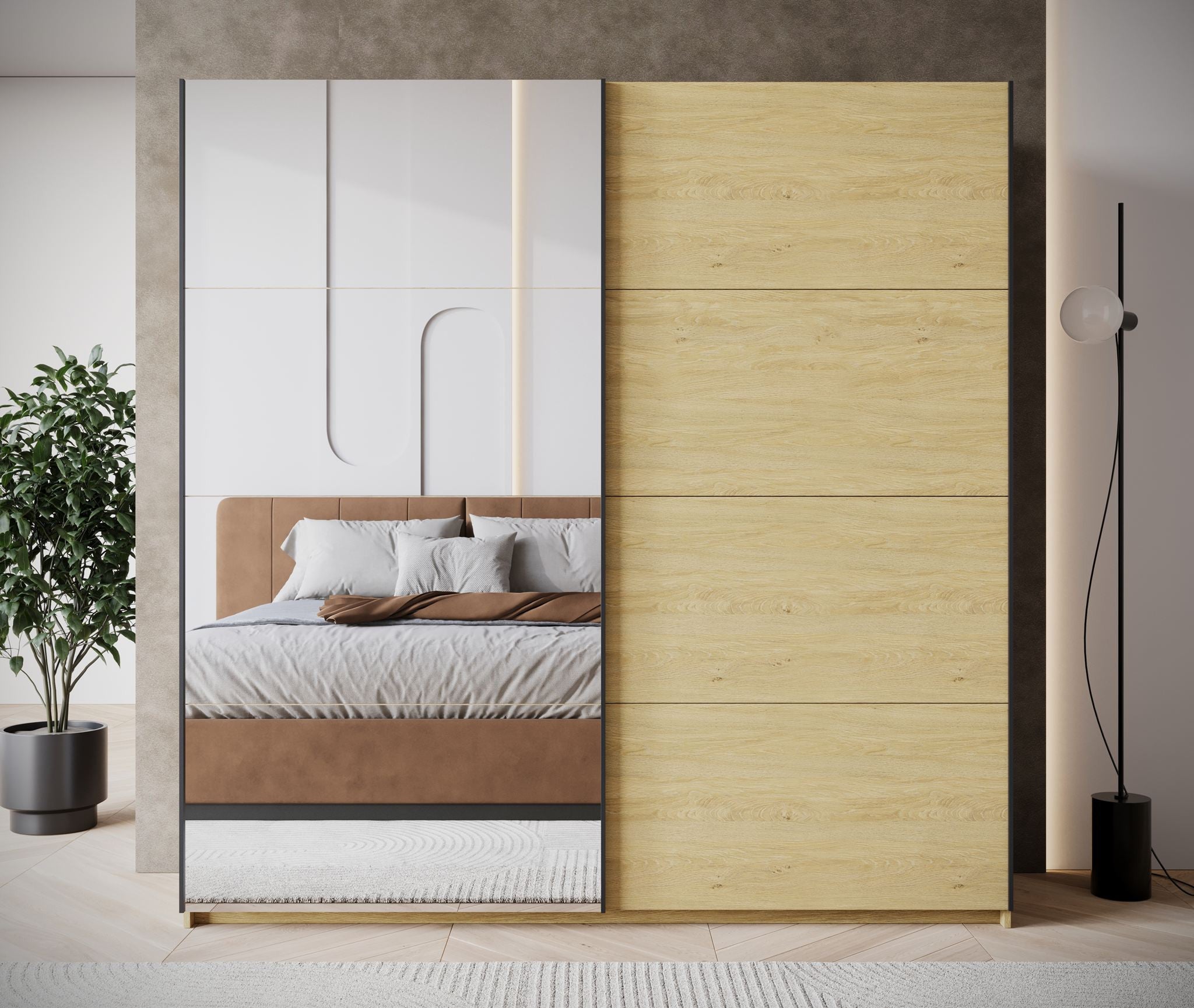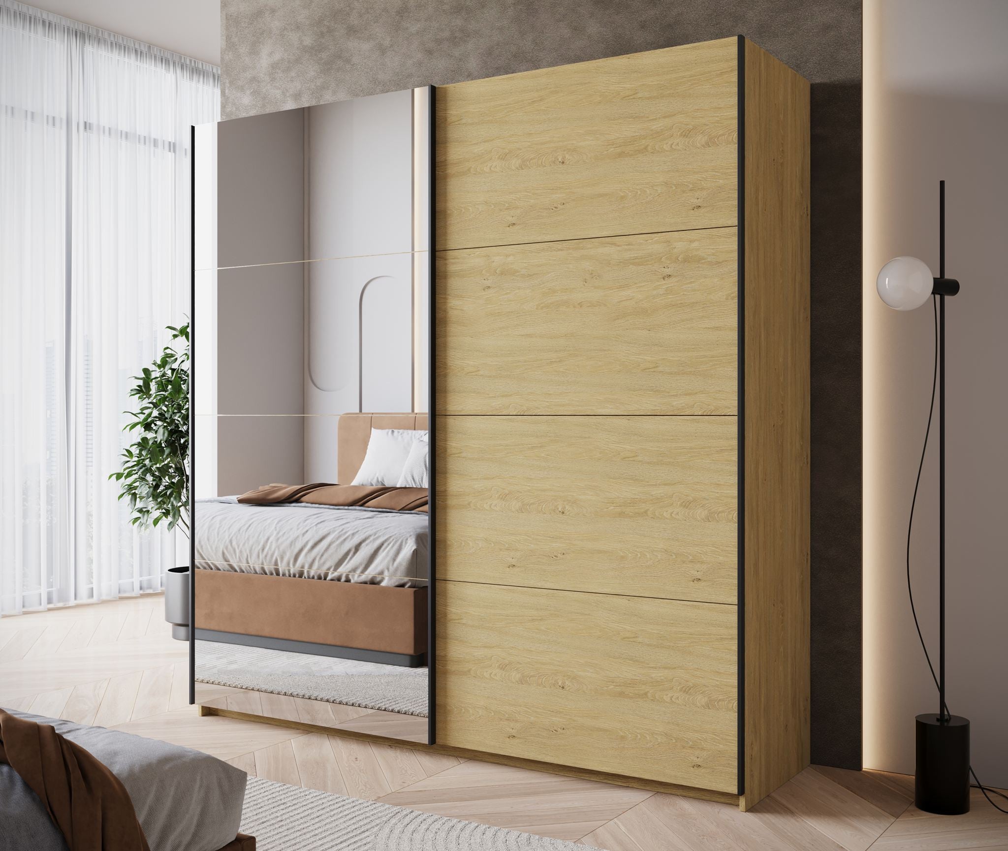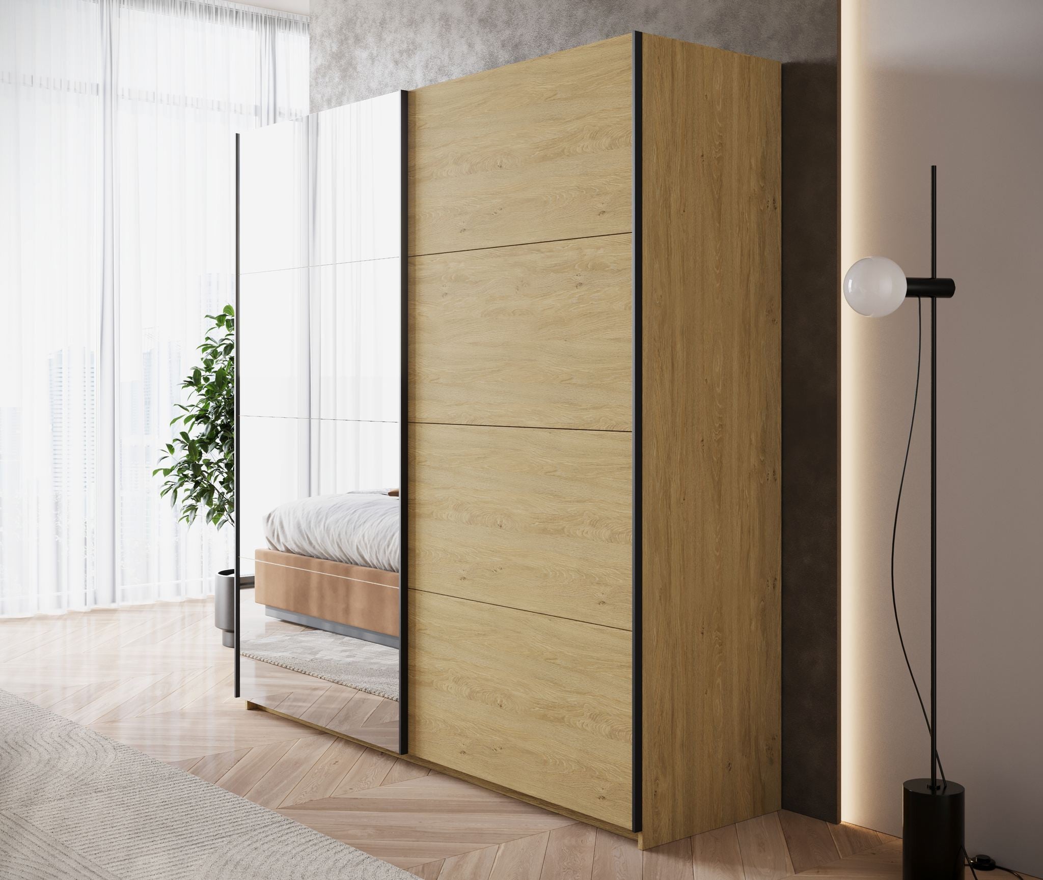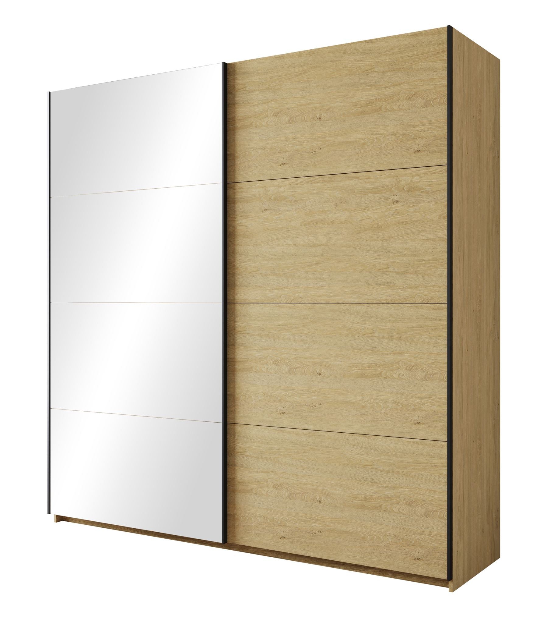 De kledingkast Zapata combineert moderne vormgeving met slimme indeling. Deze eikenkleurige garderobekast van 200 cm breed heeft twee schuifdeuren zonder grepen, wat zorgt voor een rustige uitstraling in de slaapkamer. Eén van de deuren is uitgerust met een grote spiegel – handig bij het aankleden én optisch vergrotend voor de ruimte.