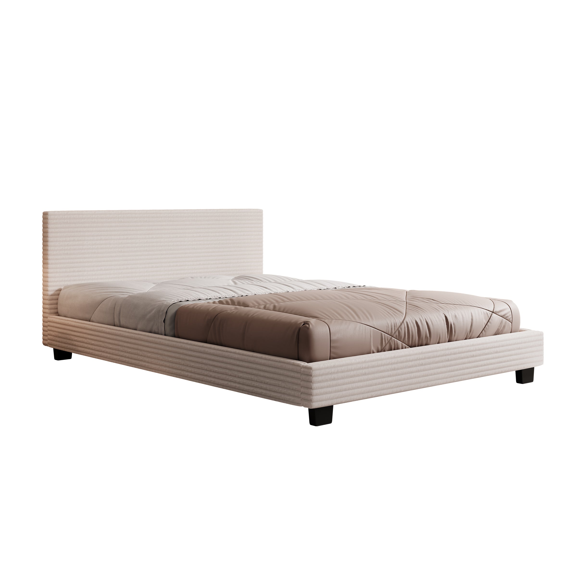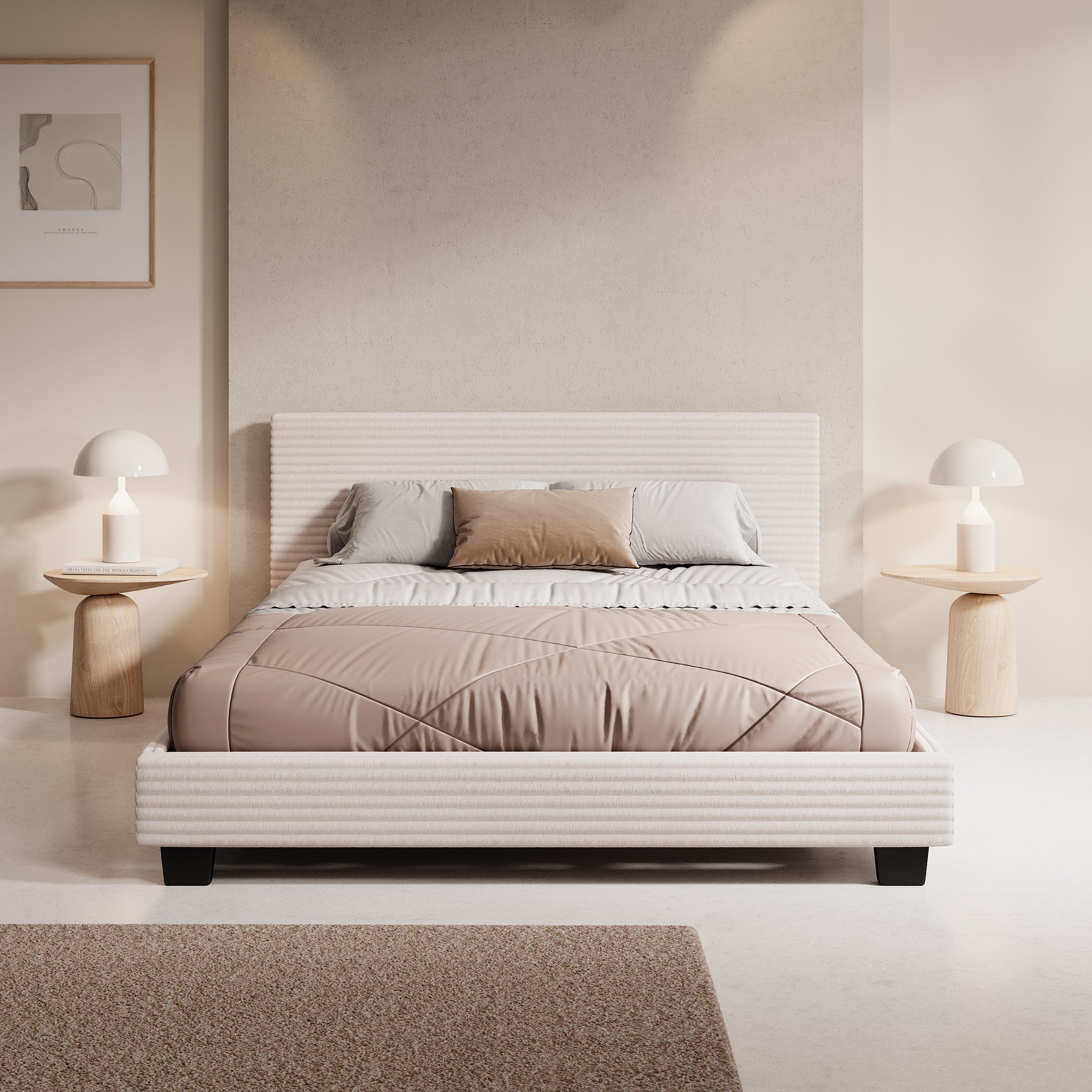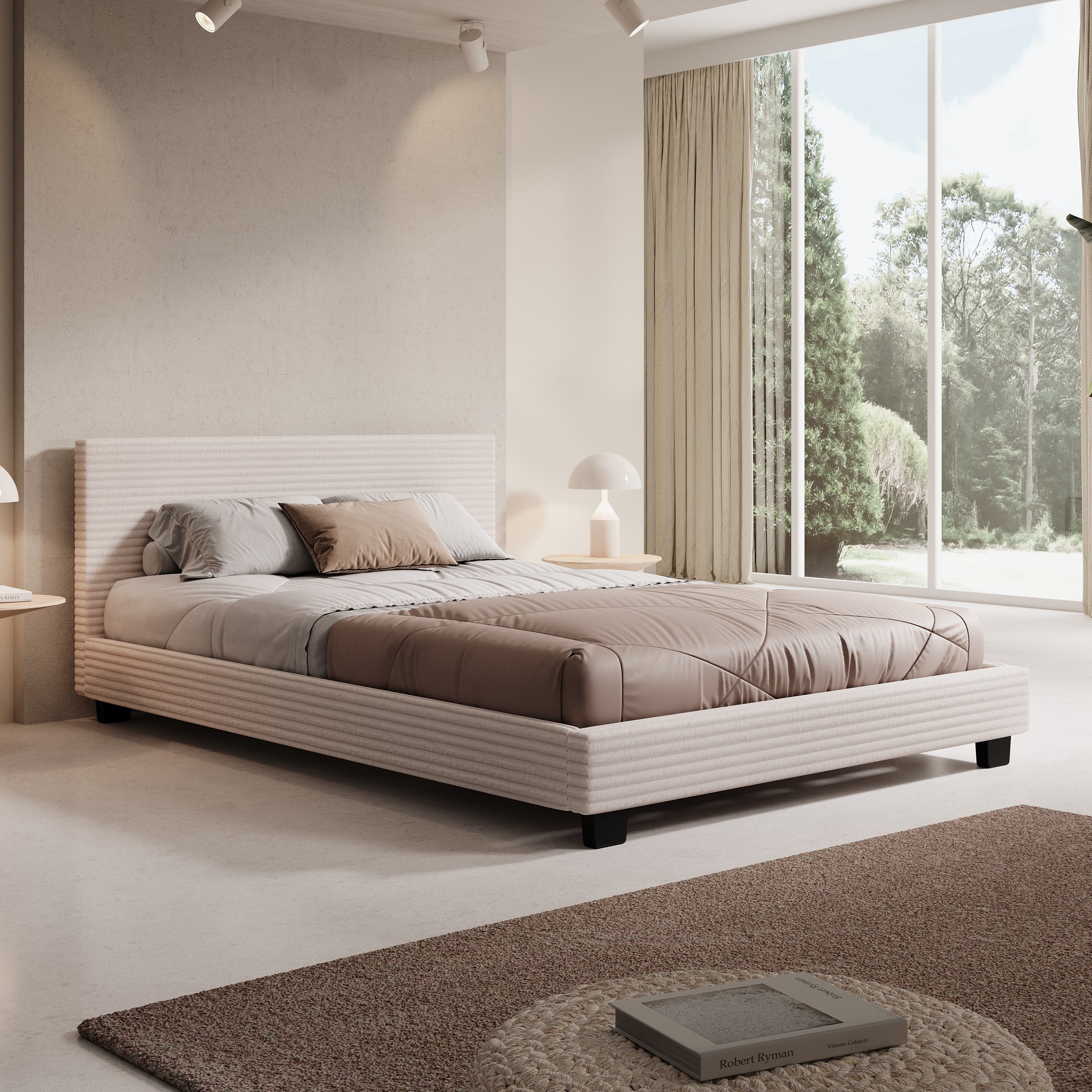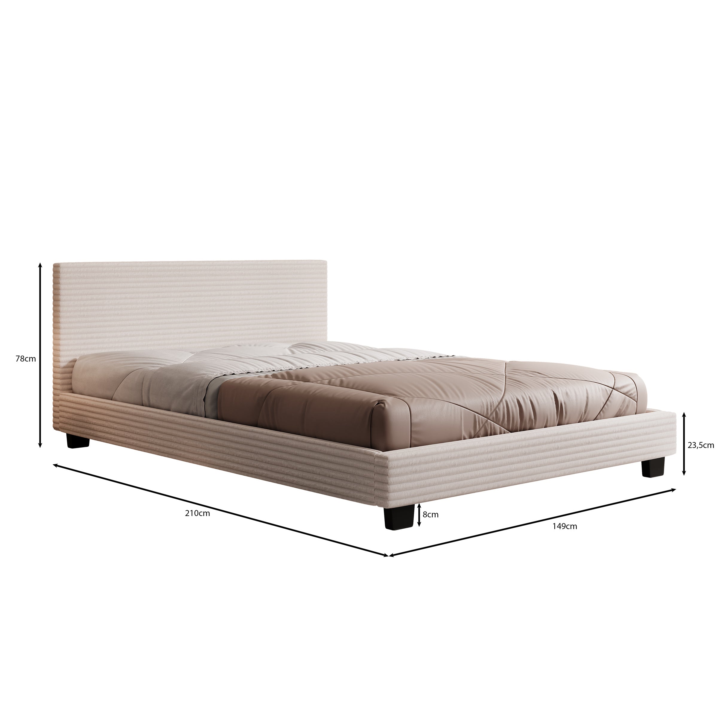 Het George tweepersoonsbed in ribstof beige combineert stijl en comfort in één. De subtiele ribstructuur geeft het bed een moderne twist, terwijl de warme beige tint zorgt voor een sfeervolle uitstraling in de slaapkamer. Met een afmeting van 140x200 cm is het een perfecte keuze voor wie houdt van compact en gezellig slapen. Het hoofdbord en de strakke belijning geven het bed een eigentijdse look, terwijl de stevige basis en zwarte poten stabiliteit en duurzaamheid garanderen. Dit bed wordt geleverd zonder matras, zodat je zelf de vrijheid hebt om een matras te kiezen die het beste bij jouw slaapcomfort past.